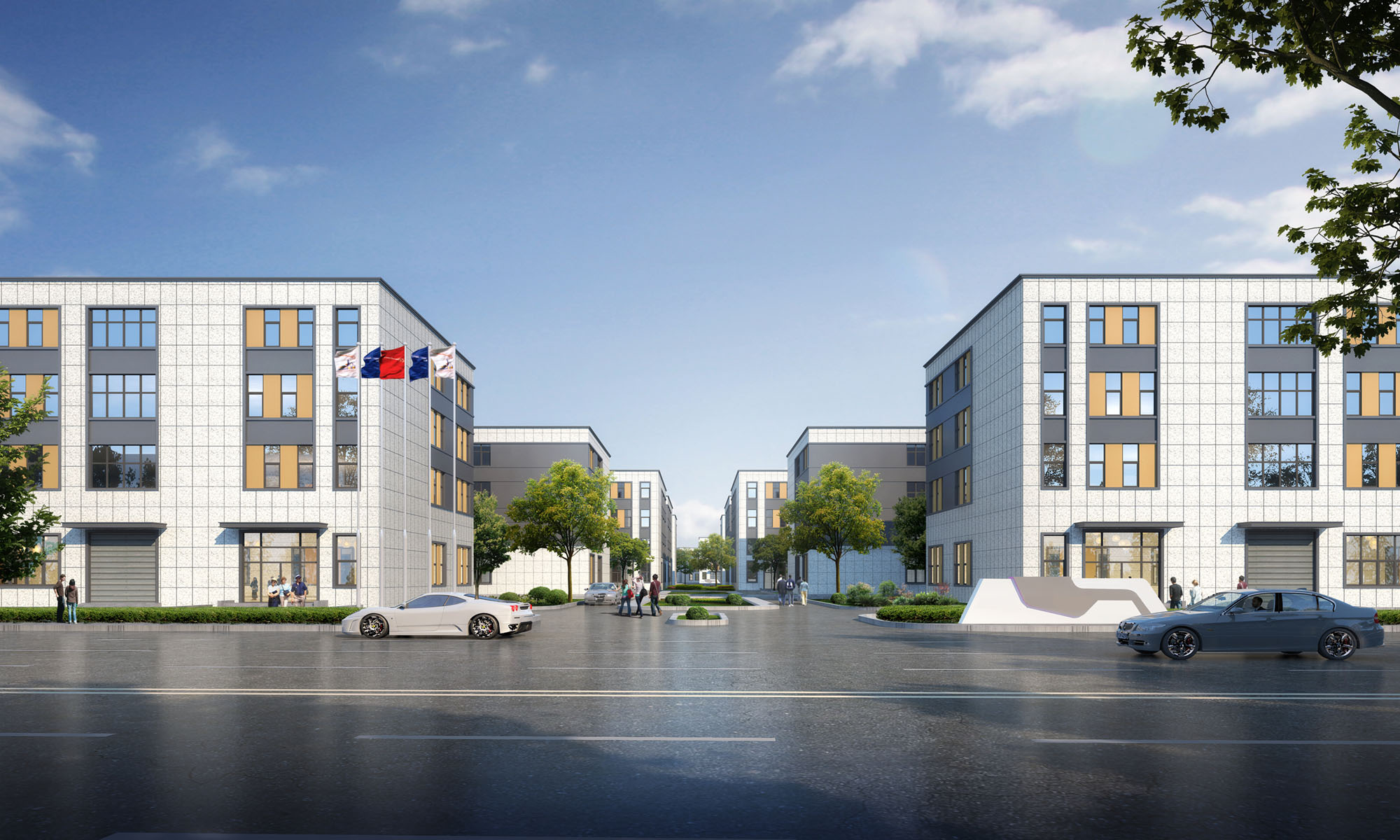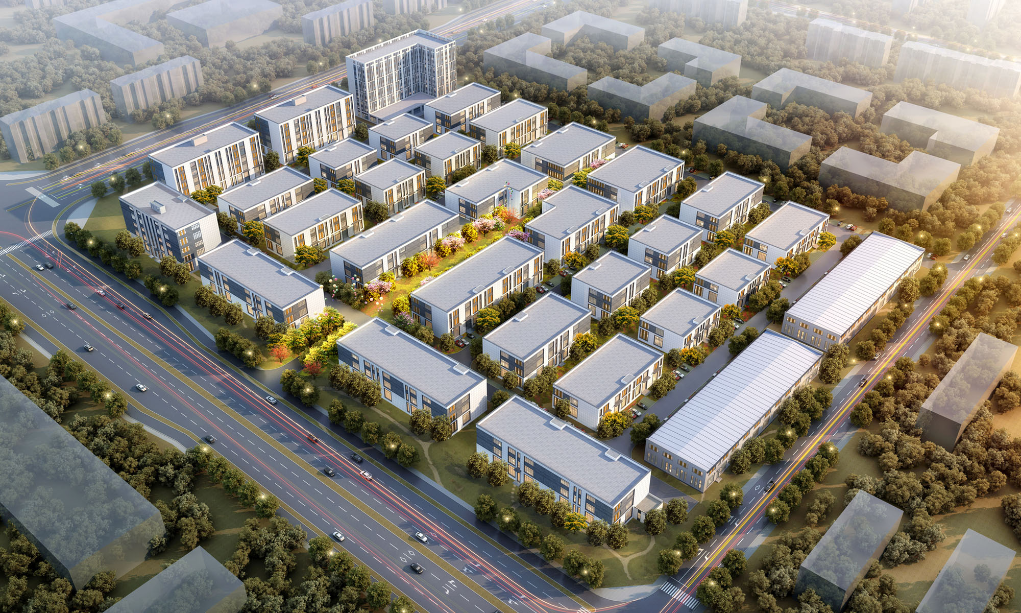 项目落位襄阳东津新区,打造电子信息+智能制造产业为主导的工作生活一体化园区。项目规划结构为“一横一纵三版块”,通过横向的形象展示轴与纵向的企业生产轴将核心企业展示版块、智能制造生产版块及生活服务配套版块串联为一个整体。景观上通过对主入口空间,中心景观广场、组团景观空间的三重主题空间的打造,形成层次递进的园区体验。园区东北角集中设置完善的配套服务设施,一应俱全的宿舍、超市、食堂、快递等功能设施,为园区员工提供完整又便捷的日常生活服务,达成工作生活一体化园区的目标。