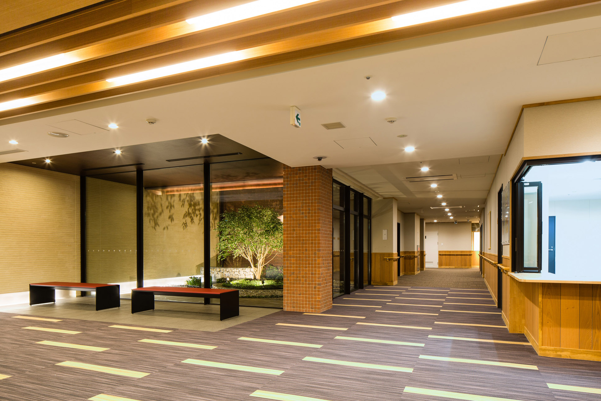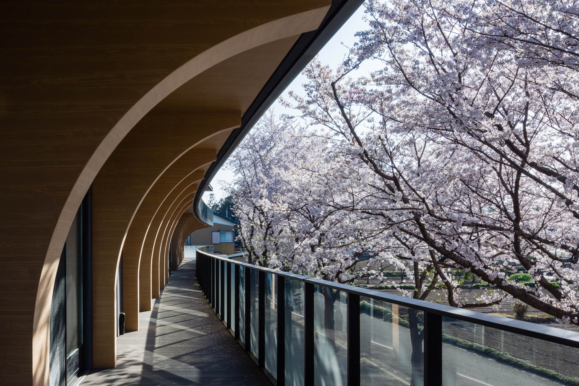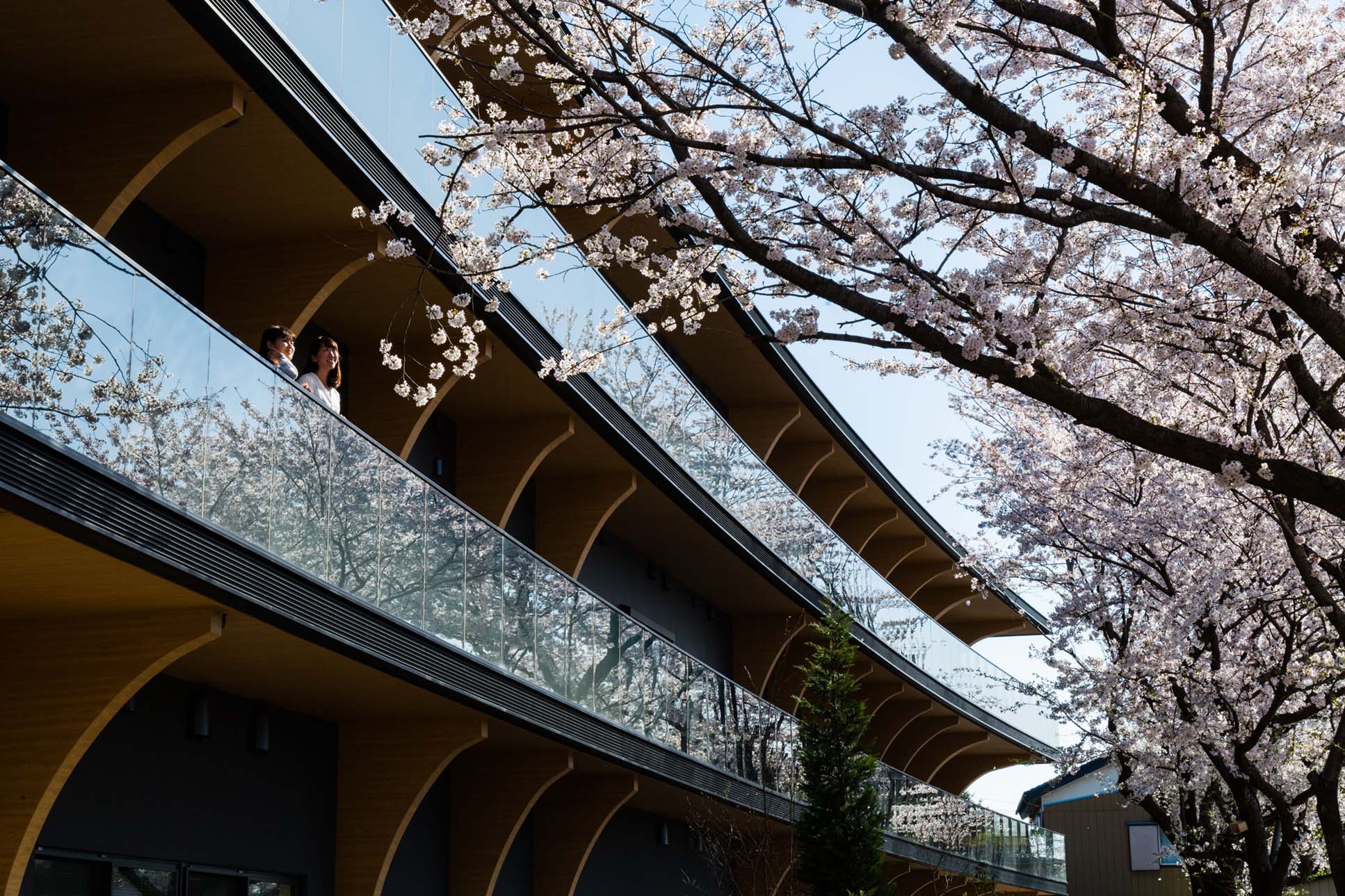 基地保留的樱花树与建筑相互辉映,通过阳台玻璃的反射,仿佛樱花盛开的美景以3D的形式投影在外墙上,更加烘托了高龄者设施温馨、美好、富有生机的居住环境。