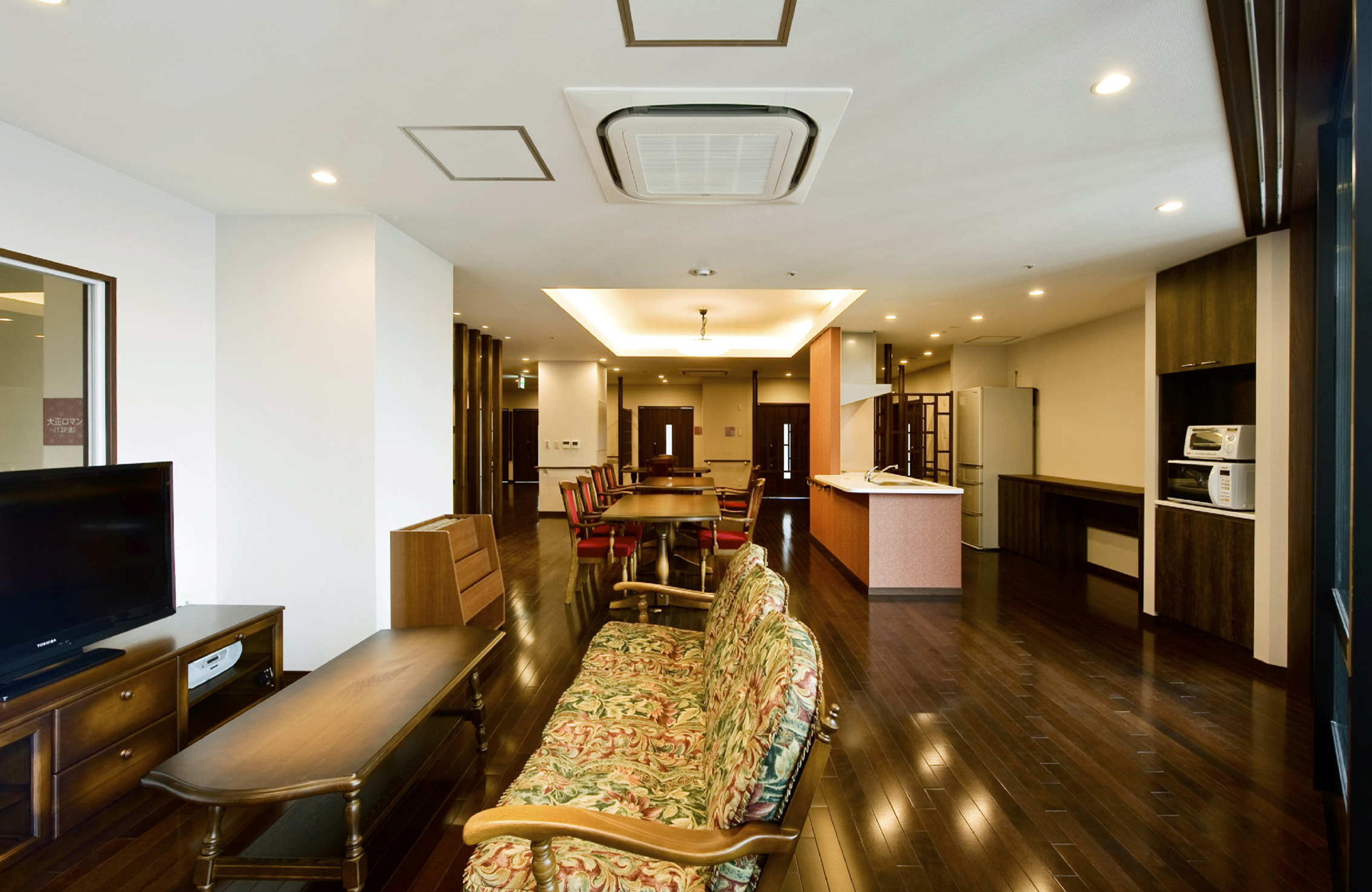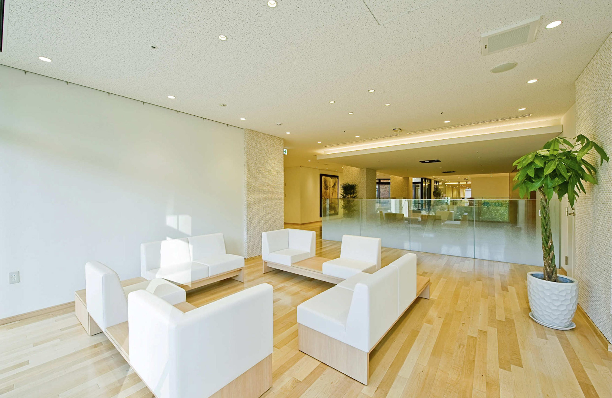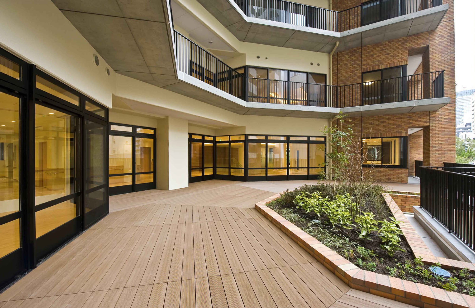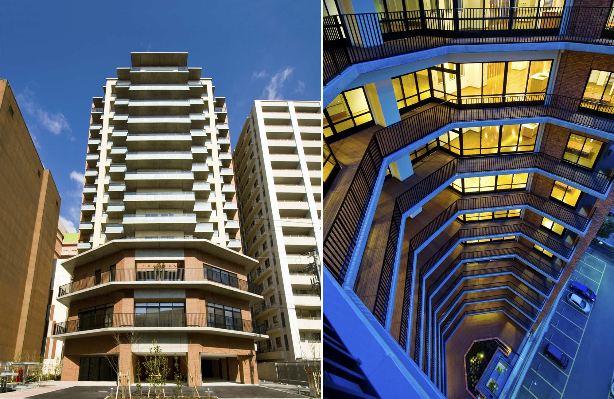 设计的亮点是既保证都心的高密度,又顾虑到居住的舒适性。在指定容积率600%(部分为700%)的市中心,设置由特别养护老人院100床、介护型轻费老人院100床、短期入院介护10床、日间服务中心等构成的综合设施。雁行式外墙和空旷的中心部,确保了全居室的双面采光。在开间狭窄的地块,而容积率超过600%的高密度建筑,设计出明亮和眺望绝佳的居住空间。