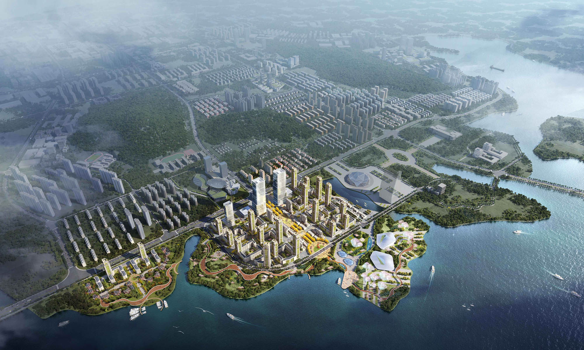 项目紧邻磁湖西岸,新城镇体系的规划理念,营造良好的湖边滨水体验及多变的公共空间;设计主题是城市秀场;采用三轴一环的规划格局,景观人文轴链接场地主入口至湖岸线的活力街区,休闲娱乐轴勾连南北商业、商务街区,滨水景观轴取义自然极光,增强人与自然的亲密接触,环线串联四个街区板块,沿城市主轴打造现代感十足的双塔城市门户形象,打造丰富灵动的商业街区及企业总部办公区;会展落位磁湖边,补足城市功能,打造磁湖西岸标志性建筑。