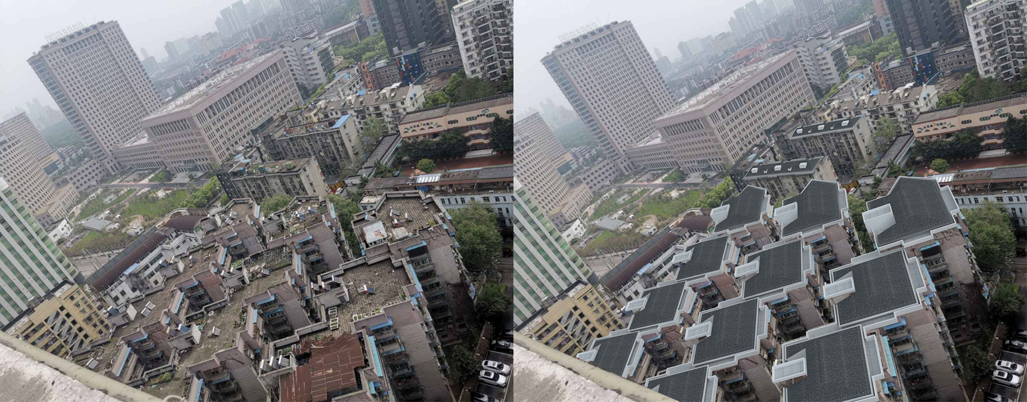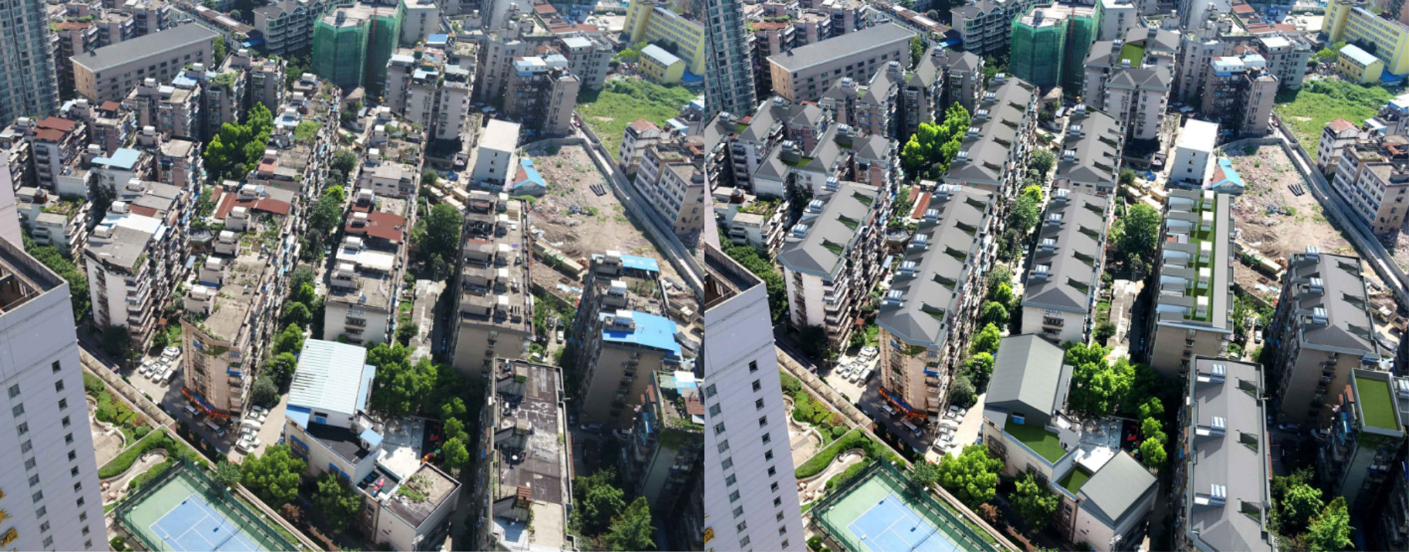 惠西小区始建于上世纪90年代,房屋年久失修。设计将对片区所属老旧房屋楼顶进行整体改造和美化提升,整治面积约2.6万平方米。此次顶面整治工程采取“平改坡”方案,将现有平面屋顶改造成坡面屋顶,实施整体美化提升,完善使用功能,可发挥防水、保温、隔热功效。