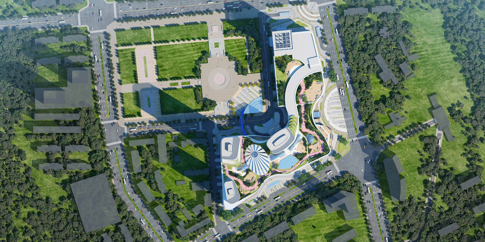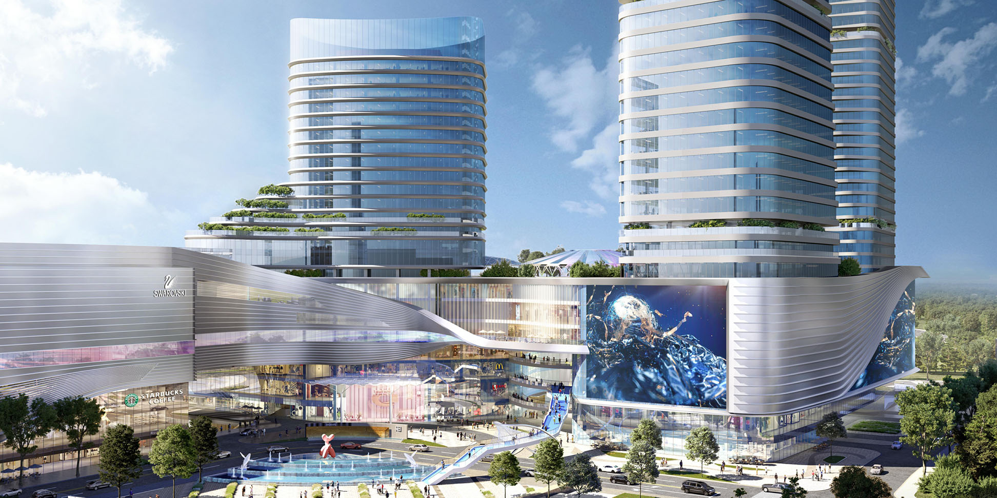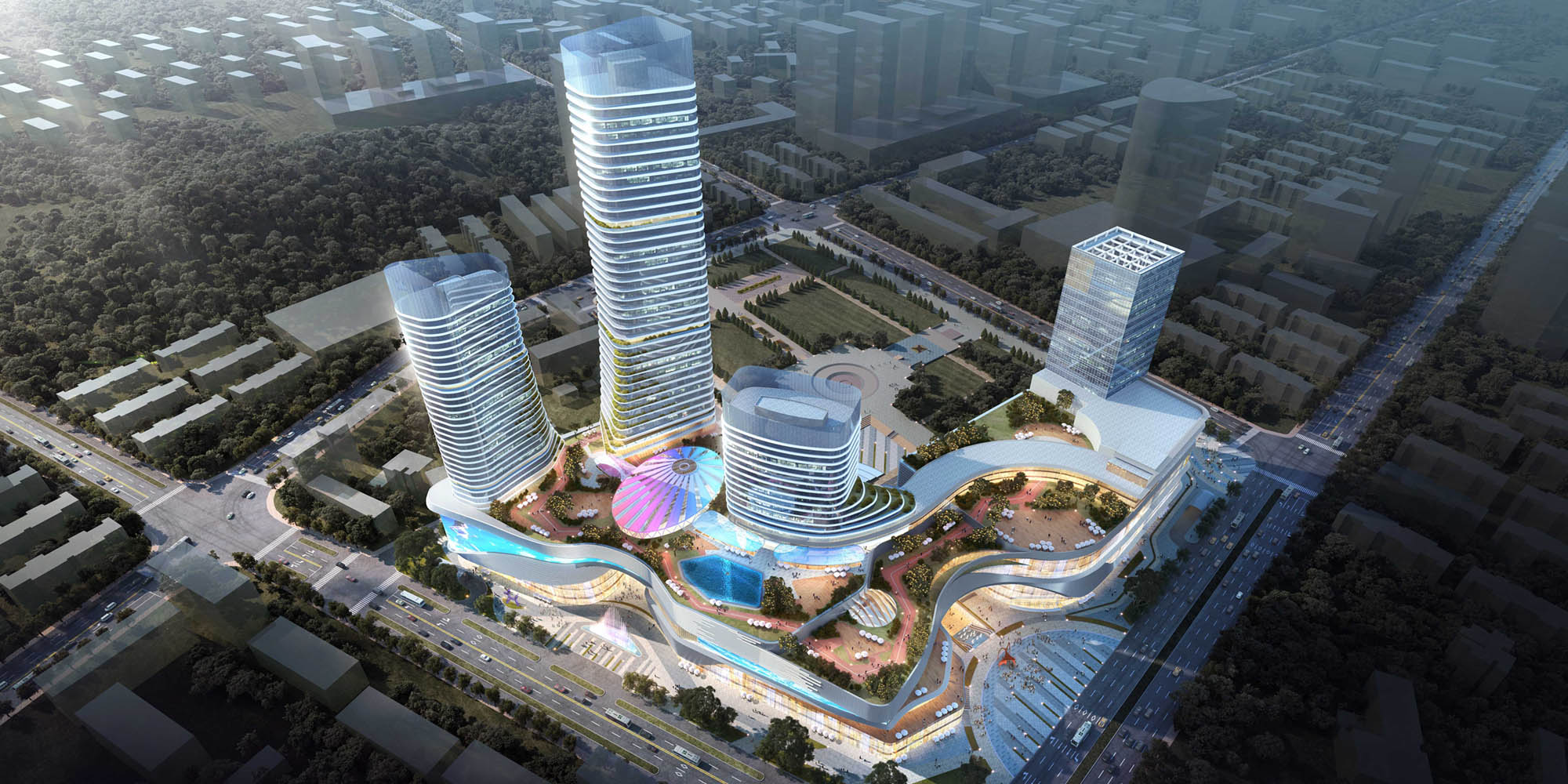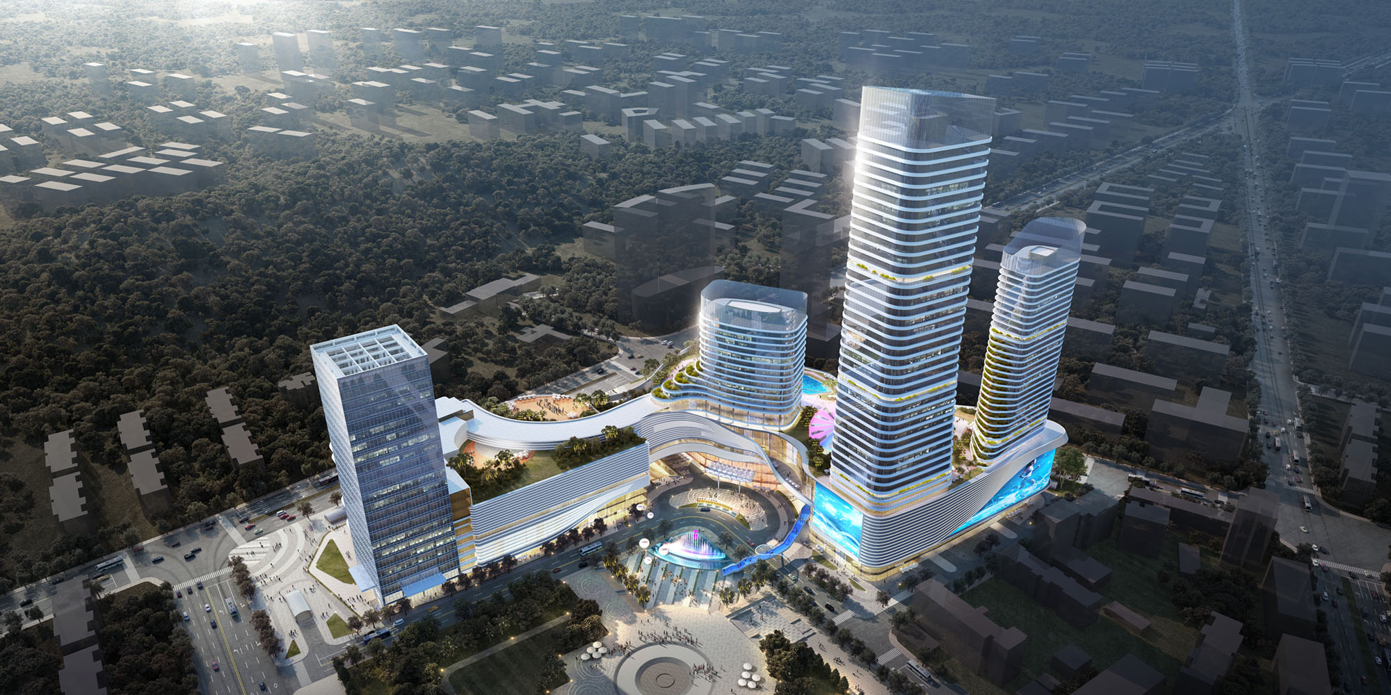 湖北宜昌中心城位于宜昌市西陵区夷陵广场商圈核心区域,是宜昌商业发展,“十四五”规划的重点项目,打造集体验式商业、酒店、公寓、生态住宅等于一体的城市新地标。商业中心则与国贸一期连接为整体,引入商业活力轴,与夷陵广场内外贯通,形成亲切开放的城市界面。三栋公建化的塔楼在商业外围呈“L型”布局,形成高低错落的城市天际线关系。设计充分尊重地域文化,通过超高层建筑和屋面退台花园设计,生动展示城市空间的有机形态。立面横向线条和参数化表皮延续了山体延绵的优雅形象。
