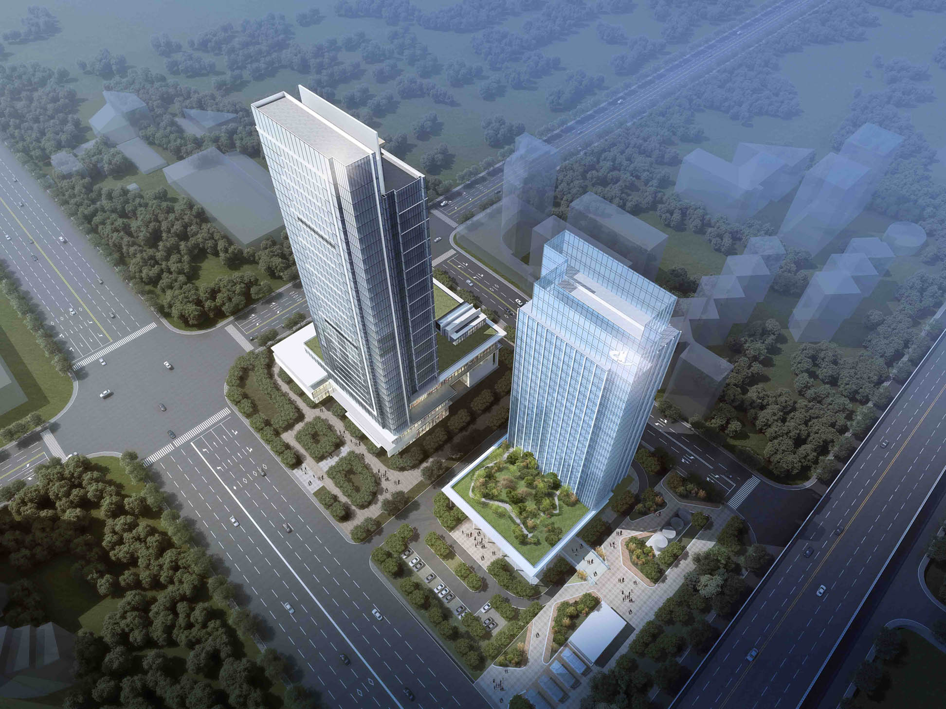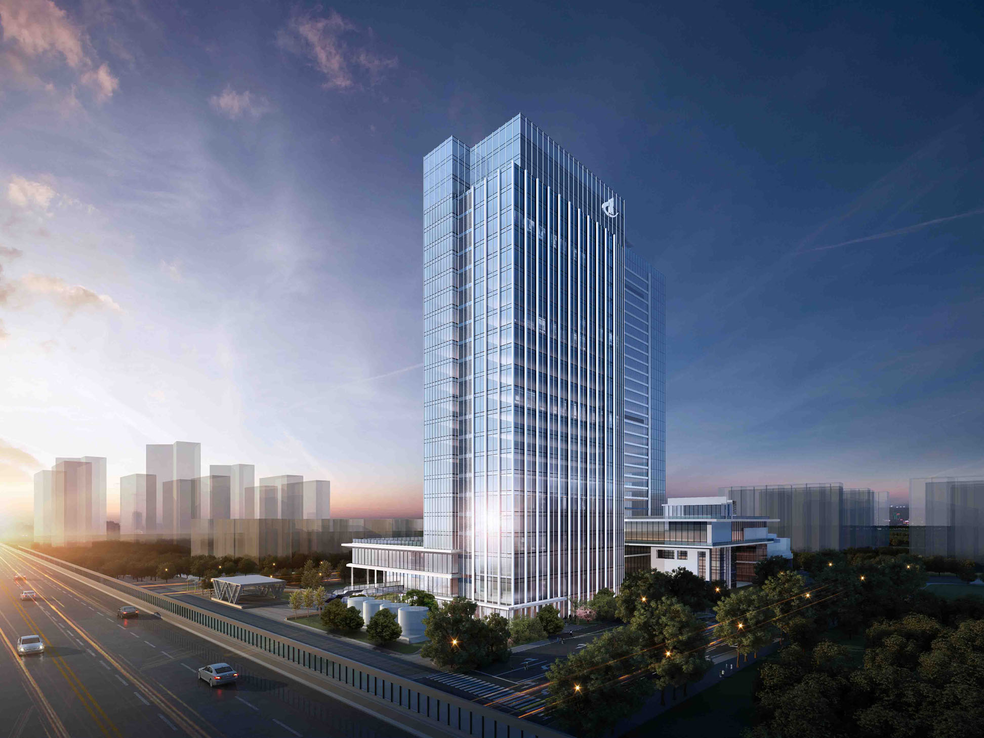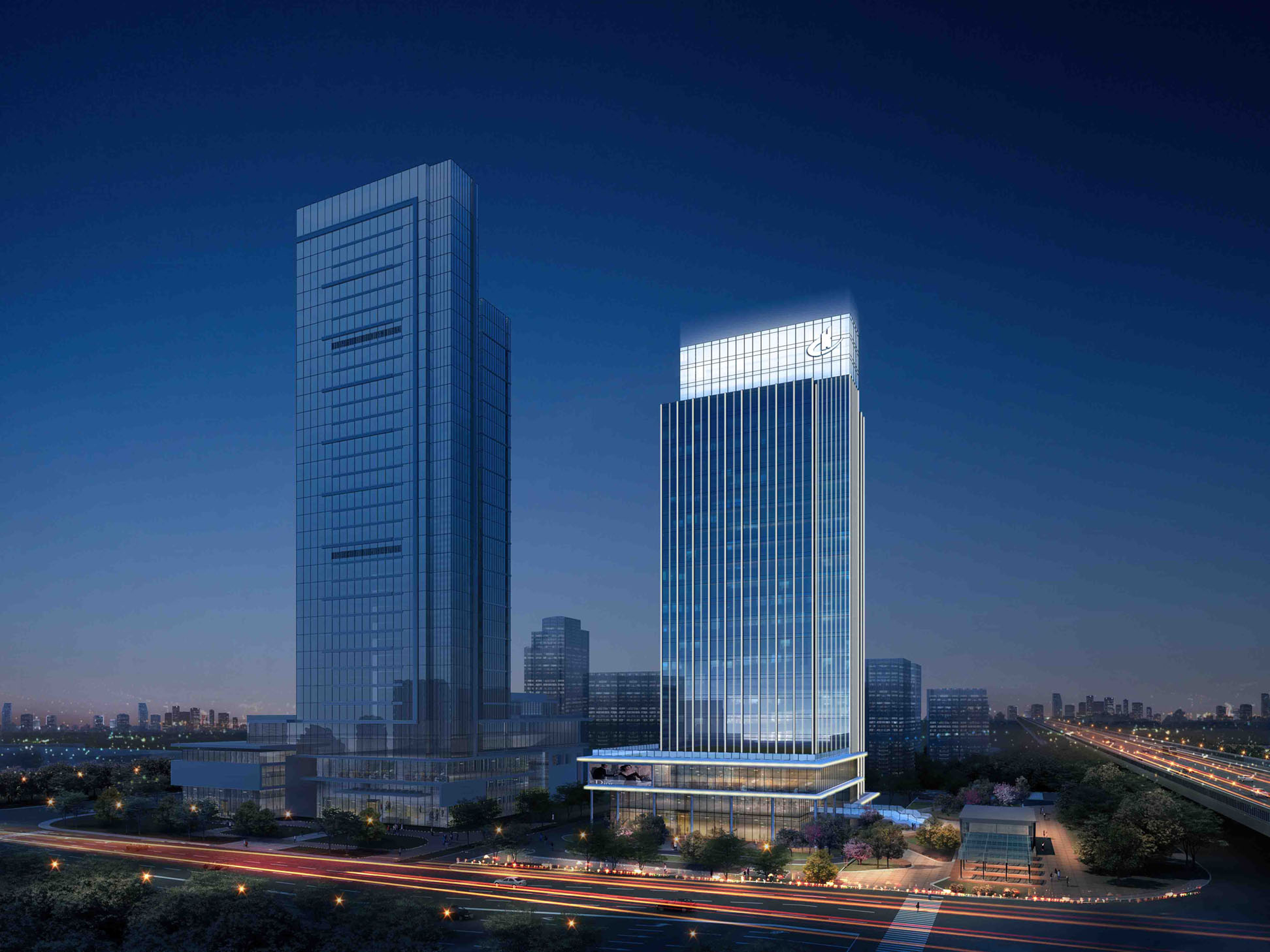 建筑采用绿色生态设计理念,注重设计的合理性、前瞻性、科技化。简洁均质的建筑外形,烘托酒店商务生活的品质格调;“城市秀场”理念的提出,强化了建筑车城之心的地域特点;大量开放式、跨维度公共空间的营造、与地铁站点的无缝对接为该项目增添了多元化和包容性的精神内核。