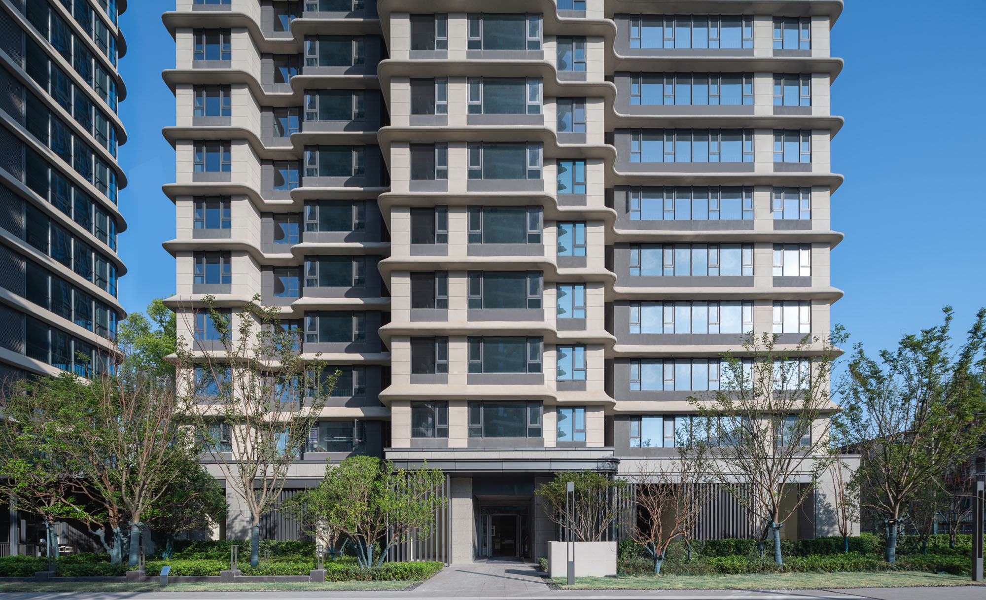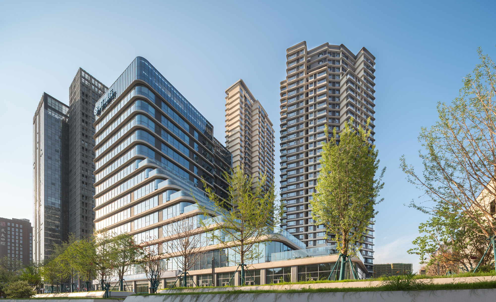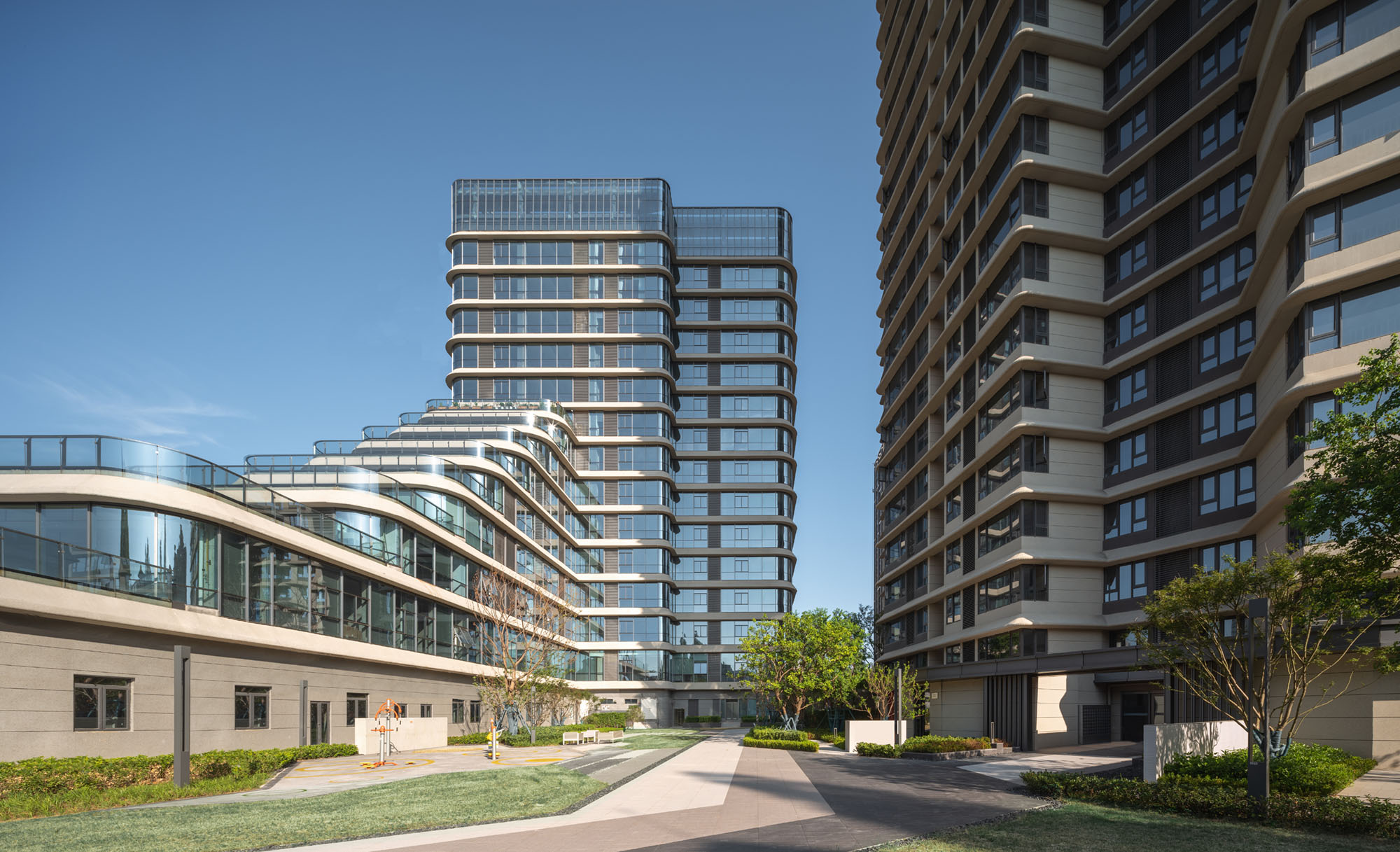 项目规划一栋办公楼,两栋住宅楼;住宅楼呈围合状,中央为景观花园及儿童活动设施。项目外立面采用现代风格,简洁利落的横向铝板线条、虚实结合的住宅外墙、虚实对比的玻璃幕墙,使建筑造型整体协调统一、端庄大方。